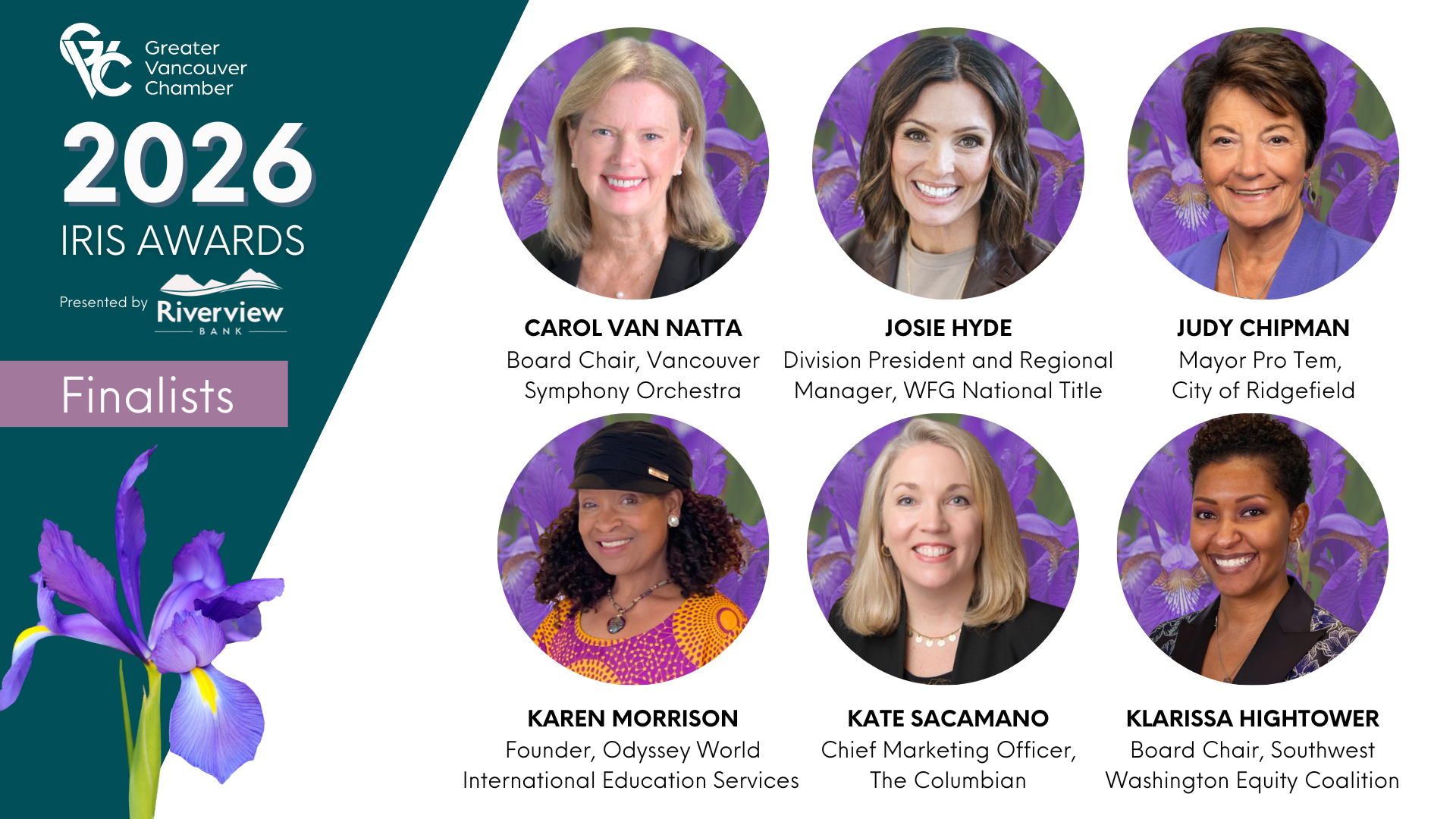 VANCOUVER, Wash. – The Greater Vancouver Chamber (GVC) is proud to announce the finalists for the 2026 Iris Awards, presented by Riverview Bank. This prestigious recognition celebrates outstanding women across Southwest Washington whose leadership, innovation, and dedication to service have created meaningful and lasting impact in their communities.